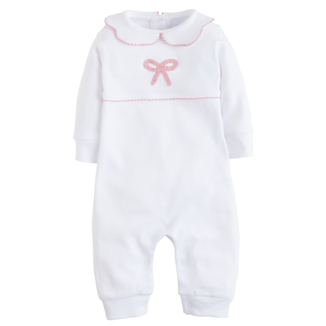 Our Pink Bow Crochet Playsuit is an adorable, signature style for baby girls with a simple pink bow design that's crocheted by hand for the sweetest look for babies. This playsuit is made from soft, 100% Peruvian Pima cotton and features light pink picot trim along the scalloped collar and across the chest. Add the matching Crochet Sweater to indulge your little one or give the gift of timeless style with this signature look!