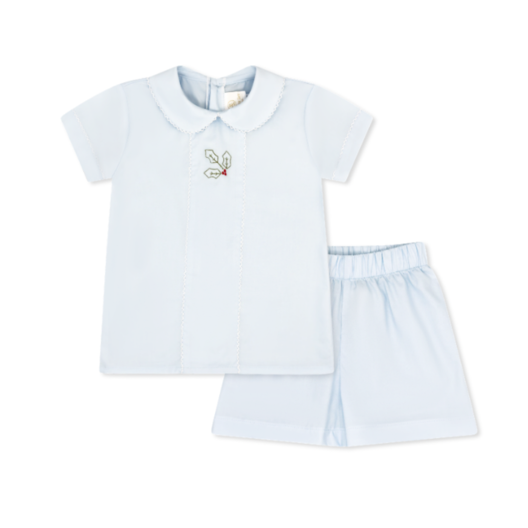 Our Jonathan Short Set is an heirloom staple for your little boy. This Blessings Blue batiste short set has a sweet holly embroidery making this the perfect outfit for the holiday season.