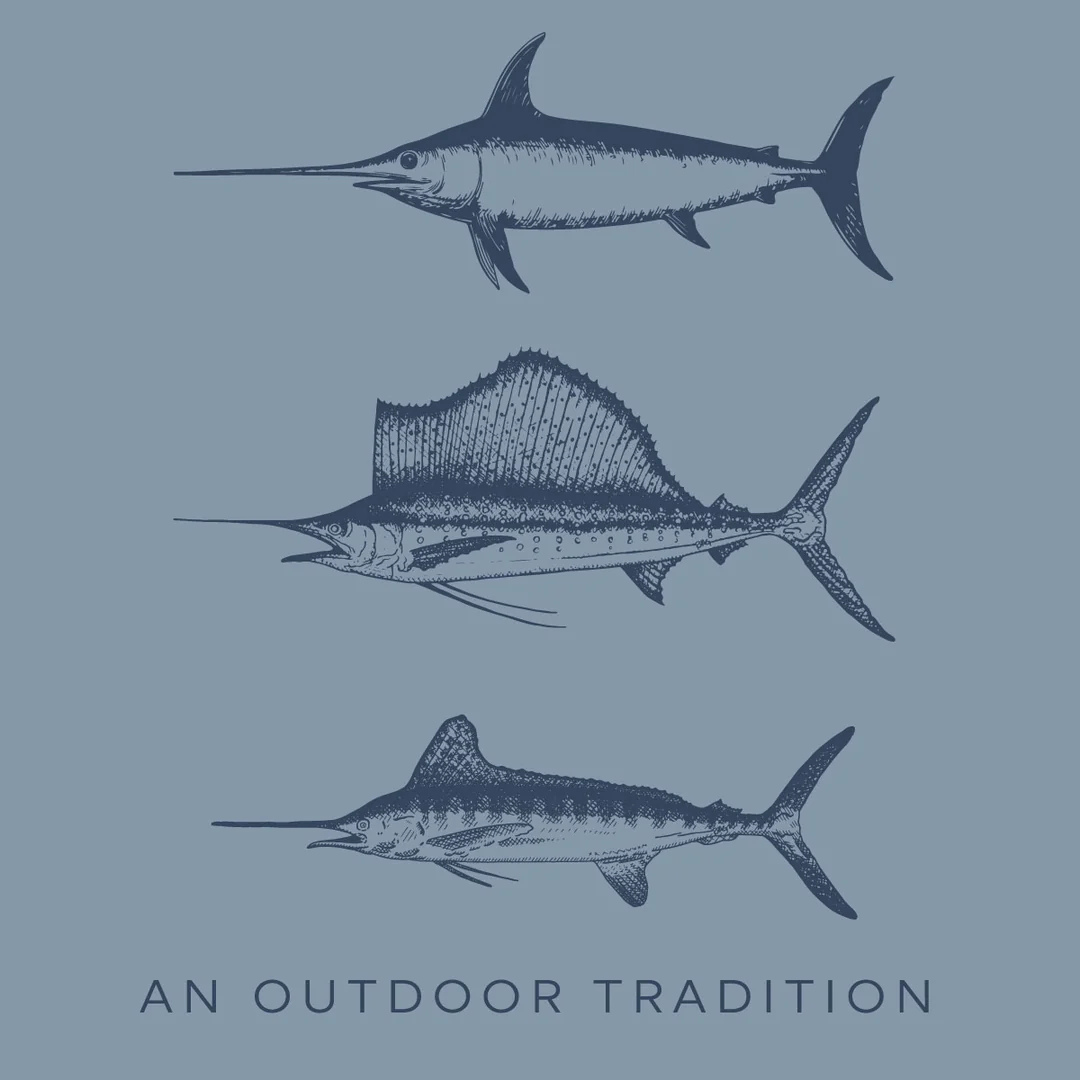 Made from lightweight, moisture-wicking fabric with built-in UPF 50+ sun protection, it keeps him dry, comfortable, and protected from harmful rays all day long. The back features a bold graphic of three iconic billfish—swordfish, sailfish, and marlin—plus the words "An Outdoor Tradition" to reflect our love for time spent outside. Moms will love the durability and easy care. Boys will love the fish.